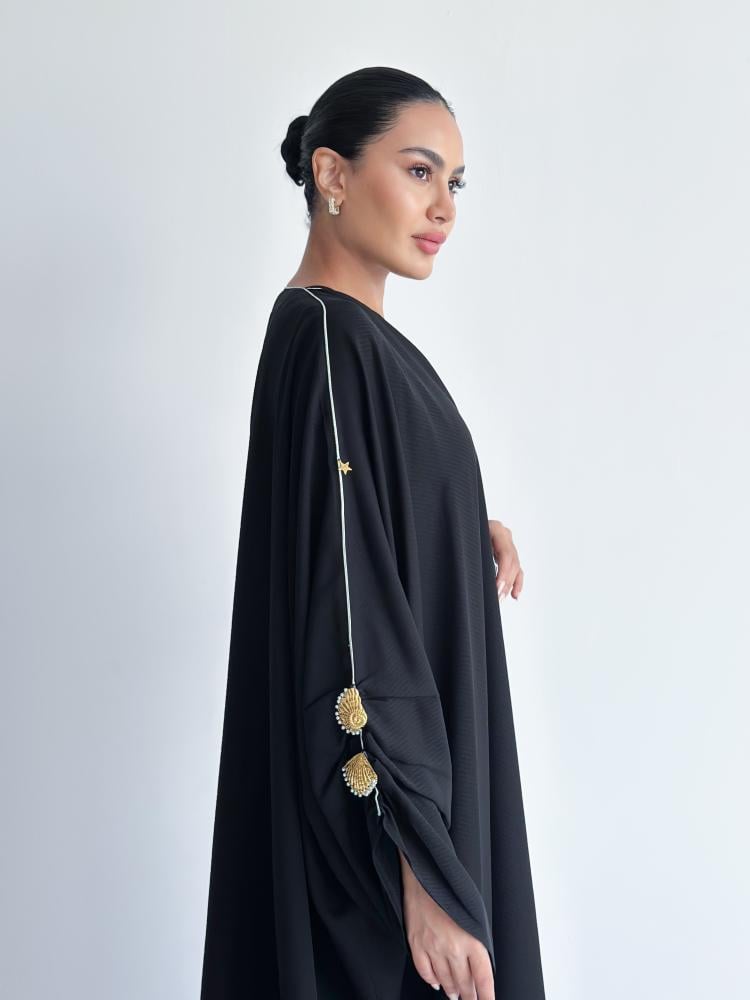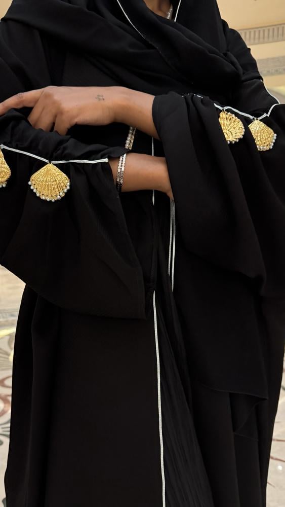 عباية كريب أسود مخطط منه وفيه مضاف له القيطان الأزرق الفاتح والصدف الذهبي مع اللولو الأزرق الفاتح